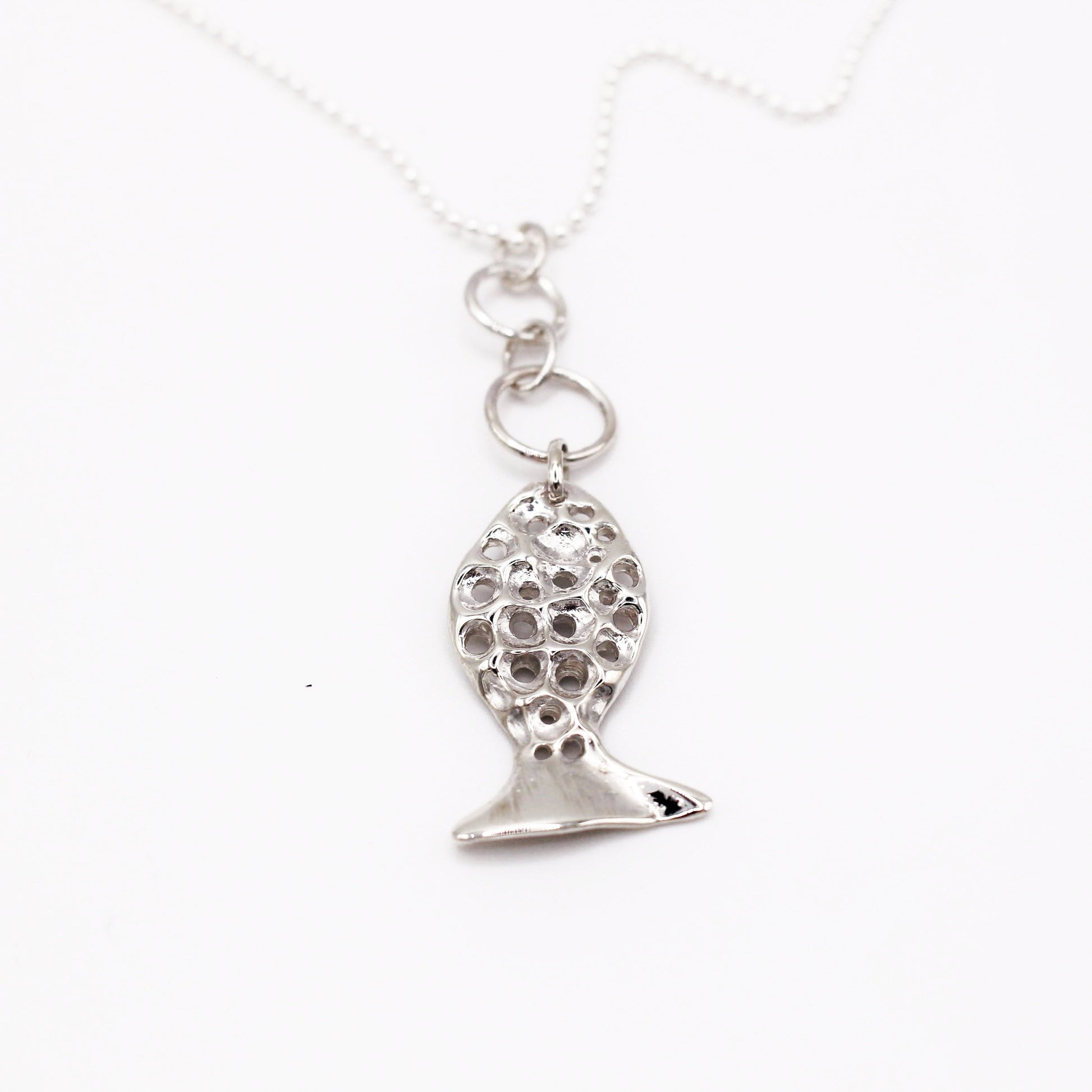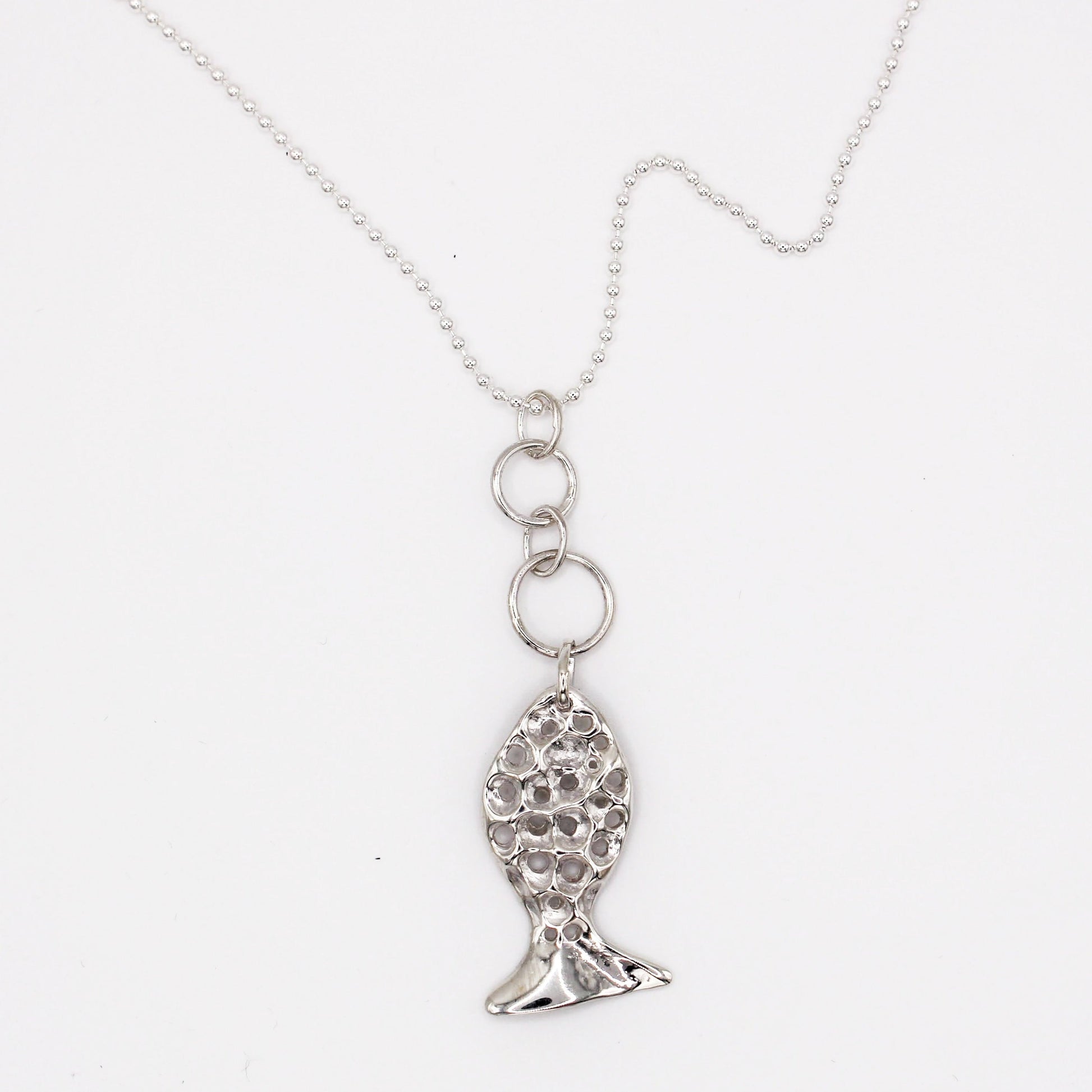 Mediterranean Inspired Silver Necklace: captures the essence of marine life, featuring an organic form fish pendant that symbolizes guidance and protection. It’s a perfect tribute to the serene beauty of the Mediterranean, designed to anchor your look with a touch of marine-themed elegance.