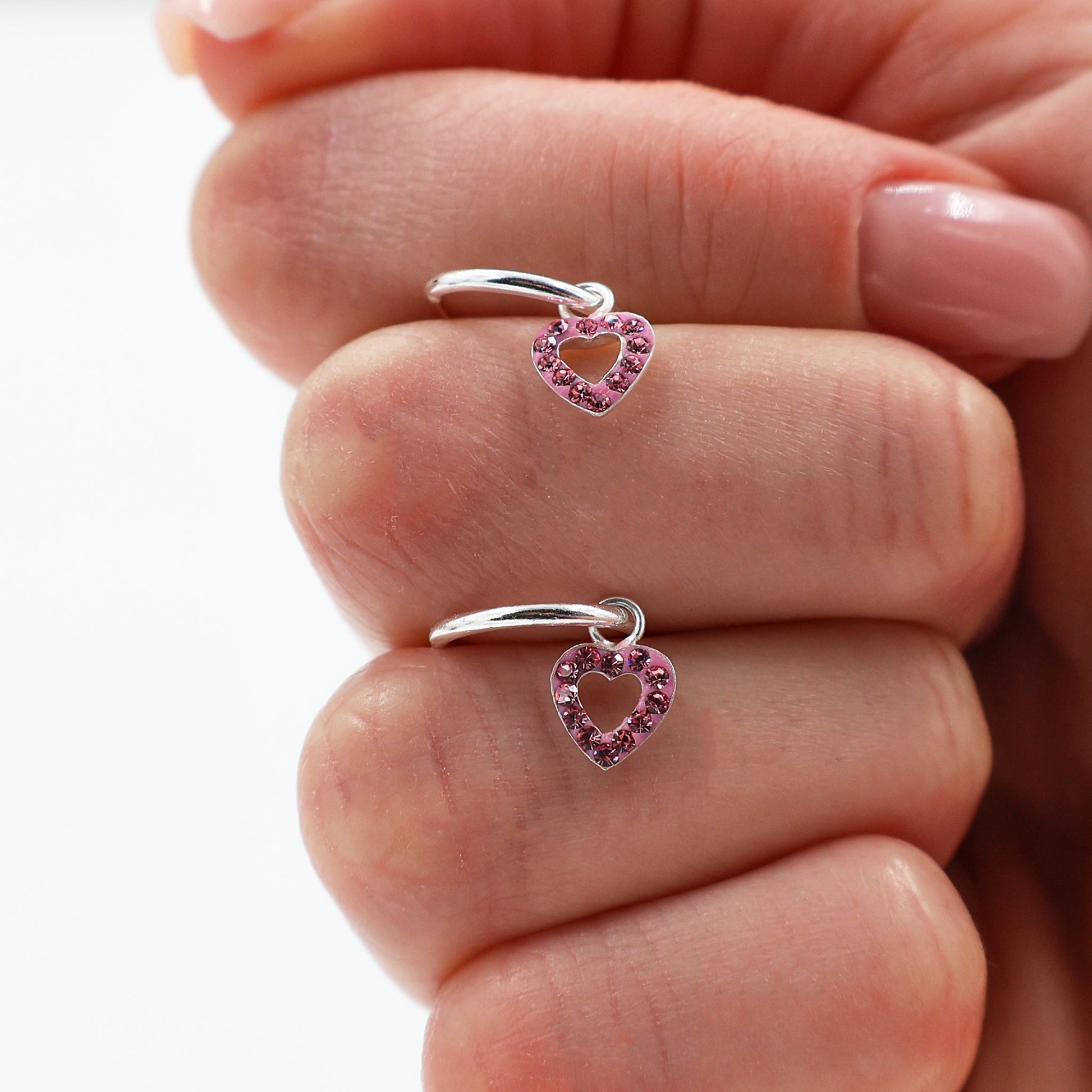 The heart pendant, symbolizing love and elegance, is beautifully encrusted with shimmering white zirconia stones, adding a sophisticated sparkle to the minimalist hoop shape.