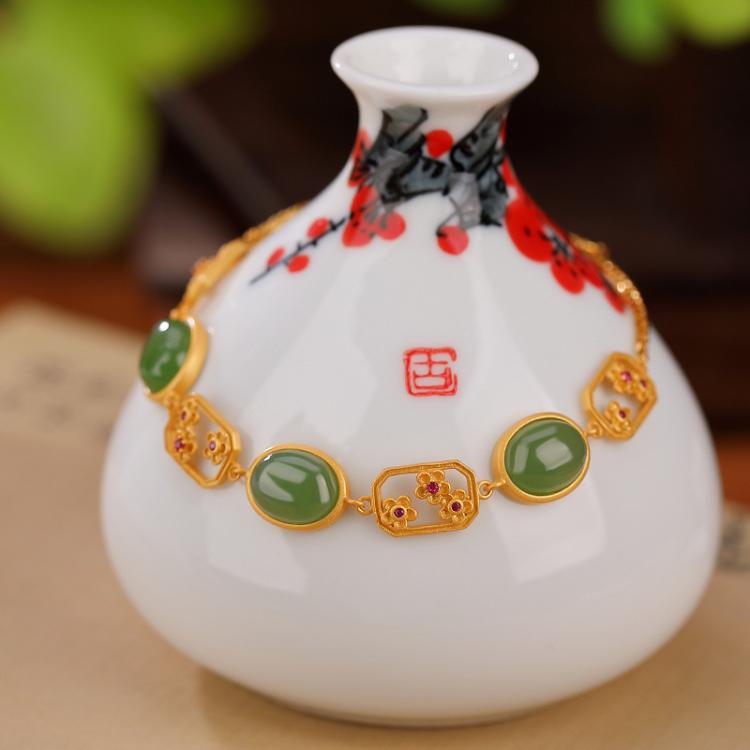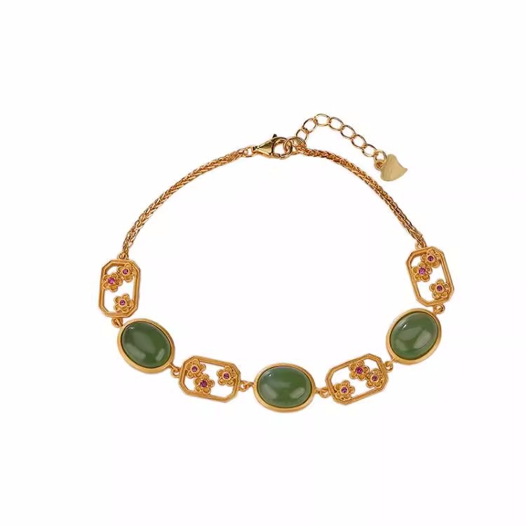 Natural Jasper Egg Noodle Bracelet S925 Sterling Silver Gold Plated Plum Hollow Out