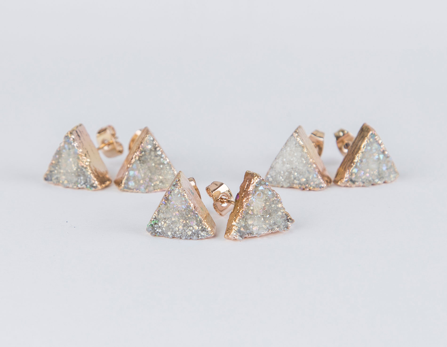 White triangle druzy earrings, very sparkly with gold plated metal studs.